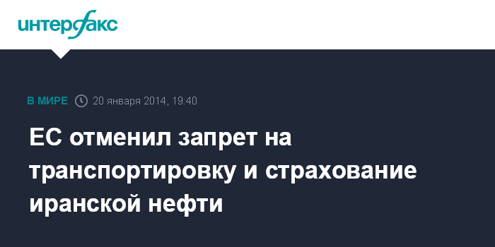 Брюссель. 20 января. INTERFAX.RU - Совет ЕС в понедельник отменил запрет на страхование и транспортировку иранской нефти, говорится в распространенном в Брюсселе постановлении.