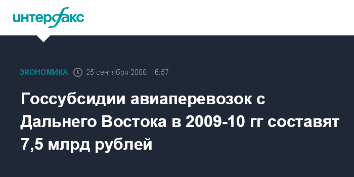 Москва. 25 сентября. INTERFAX.RU - Премьер-министр РФ Владимир Путин заявил, что в 2009-2010 гг. государство выделит 7,5 млрд рублей на субсидирование пассажирских авиаперевозок с Дальнего Востока в европейскую часть России и обратно, а также на перелеты внутри Дальневосточного региона РФ.