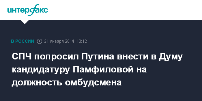 Москва. 21 января. INTERFAX.RU - Совет при президенте РФ по правам человека опубликовал обращение к главе государства с просьбой внести в Госдуму кандидатуру Эллы Памфиловой на должность российского омбудсмена.