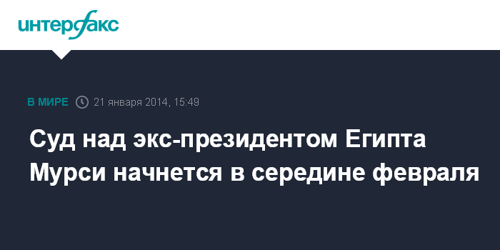 Москва. 21 января. INTERFAX.RU - Слушания по делу свергнутого президента-исламиста Египта Мухаммеда Мурси стартуют 16 февраля, сообщает во вторник египетская газета "Аль-Масри аль-Яум".