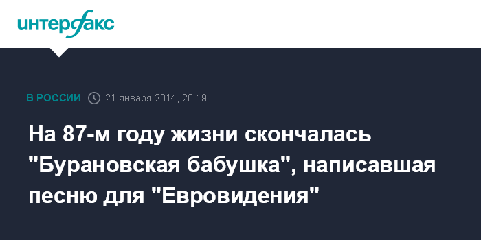 Москва. 21 января. INTERFAX.RU - В Удмуртии на 87-м году жизни скончалась одна из солисток группы "Бурановские бабушки" Елизавета Зарбатова.