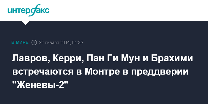 Москва. 22 января. INTERFAX.RU - Встреча главы МИД РФ Сергея Лаврова, госсекретаря США Джона Керри, генсека ООН Пан Ги Муна и представителя ООН по Сирии Лахдара Брахими в преддверии международной конференции по Сирии "Женева-2" началась в Монтре.