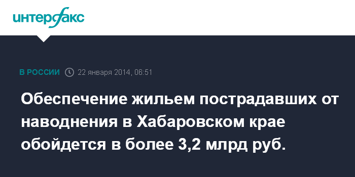 Москва. 22 января. INTERFAX.RU - Хабаровский край получил все средства, запланированные в федеральном бюджете на обеспечение жильем пострадавших от паводка 2013 года, строительство завершит до сентября 2014 года, сообщил в среду замгубернатора региона по ЖКХ и ТЭК Андрей Вологжанин.