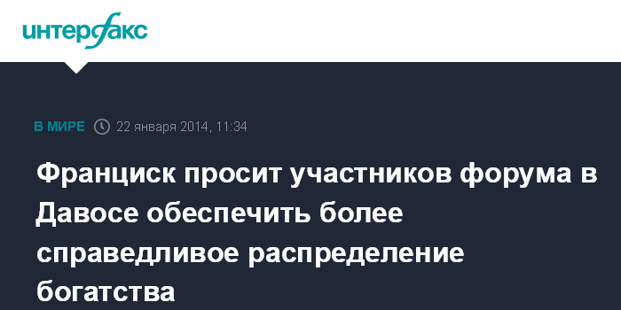 Москва. 22 января. INTERFAX.RU - Папа римский Франциск в среду призвал участников стартующего в швейцарском Давосе Всемирного экономического форума пересмотреть систему распределения материальных благ в интересах всего человечества.