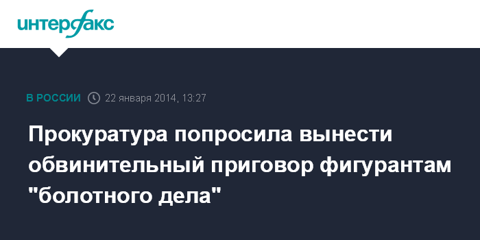 Москва. 22 января. INTERFAX.RU - Прокуратура в ходе прений просит Замоскворецкий суд вынести обвинительный приговор в отношении восьми фигурантов дела о массовых беспорядках на Болотной площади 6 мая.