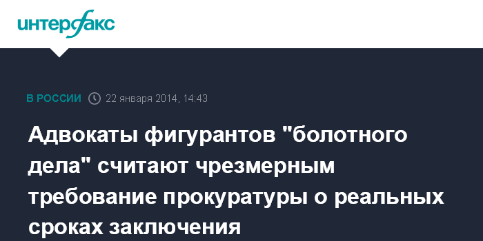 Москва. 22 января. INTERFAX.RU - Защита восьми фигурантов дела о массовых беспорядках на Болотной площади, которых в среду в ходе прений прокуратура попросила приговорить к реальным срокам лишения свободы, считает требование гособвинения неадекватным.