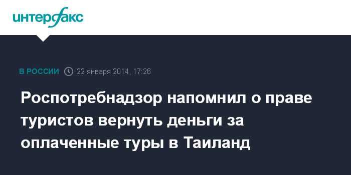 Москва. 22 января. INTERFAX.RU - Туристы, которые отказываются от поездок в Таиланд из-за беспорядков в Бангкоке, вправе получить компенсацию в полном объеме, заявили в Роспотребнадзоре.