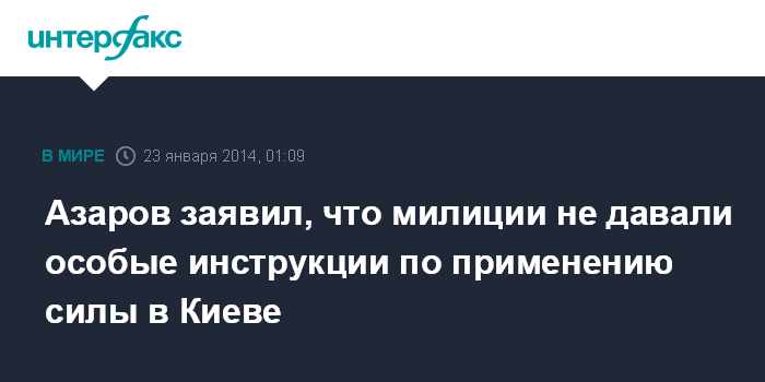 Москва. 22 января. INTERFAX.RU - Правительство Украины не давало правоохранительным органам никаких дополнительных инструкций по применению силы к агрессивно настроенным протестующим, заявил премьер-министр Николай Азаров в Швейцарии в интервью телеканалу ВВС.