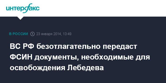 ВС РФ безотлагательно передаст ФСИН документы, необходимые для освобождения Лебедева