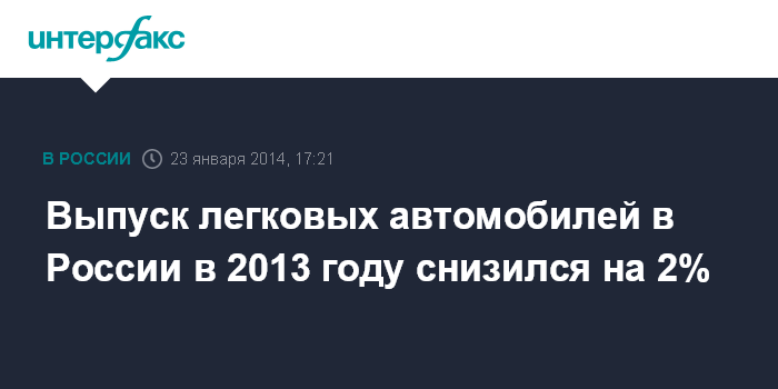 Москва. 23 января. INTERFAX.RU - Производство легковых автомобилей в России в 2013 г. сократилось на 2% по сравнению с 2012 годом - до 1,9 млн единиц.