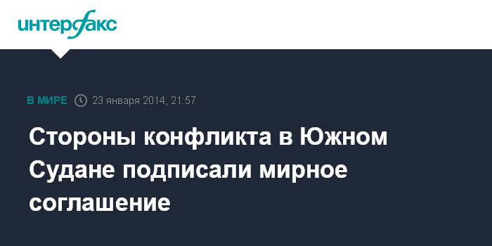 Москва. 23 января. INTERFAX.RU - Власти Южного Судана и мятежники подписали в четверг мирное соглашение, передает агентство EFE.