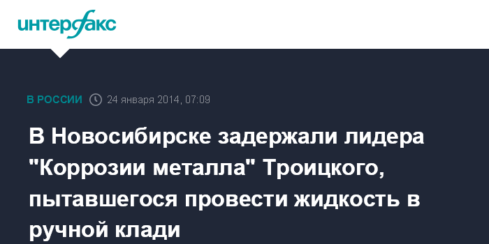 Москва. 24 января. INTERFAX.RU - Лидер группы "Коррозия металла" Сергей ("Паук") Троицкий задержан в аэропорту "Толмачево" в Новосибирске после конфликта со службой авибезопасности утром в пятницу, сообщили агентству "Интерфакс-Сибирь" в пресс-службе управления на транспорте МВД по Сибирскому федеральному округу.