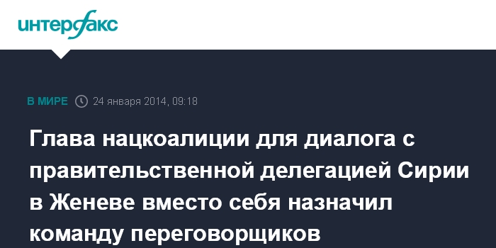Женева. 24 января. INTERFAX.RU - Глава делегации сирийской оппозиции в Женеве и лидер национальной коалиции сирийских оппозиционных и революционных сил Ахмед Джарба назначил переговорщиков вместо себя для диалога с правительственной сирийской делегацией, стартующего в пятницу.