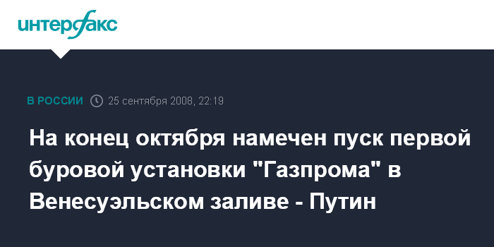 Ново-Огарево. 25 сентября. ИНТЕРФАКС - "Газпром" в конце октября начнет бурение в Венесуэльском заливе, сообщил премьер-министр РФ Владимир Путин.