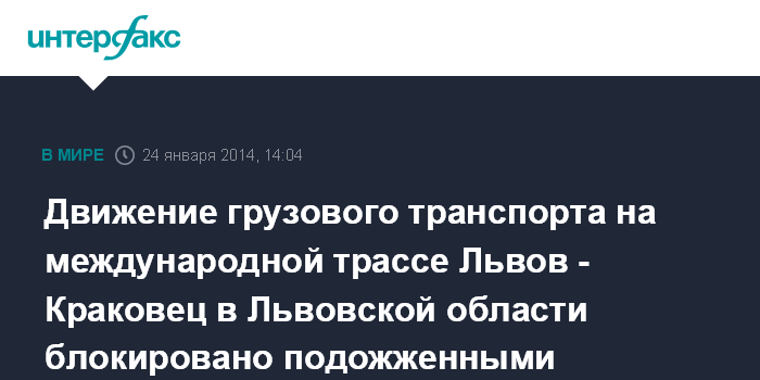 Львов. 24 января. INTERFAX.RU - Более 100 молодых людей в пятницу частично заблокировали международную трассу Львов - Краковец В Львовской области, сообщили агентству "Интерфакс-Украина" в отделе связей с общественностью областного управления МВД.