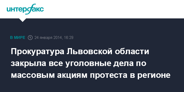 Львов. 24 января. INTERFAX.RU - Прокуратура Львовской области закрыла все уголовные производства, возбужденные в связи с массовыми акциями протеста в регионе.