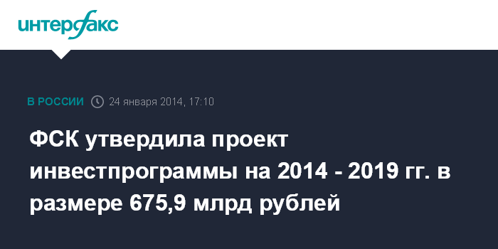 Москва. 24 января. INTERFAX.RU - Правление ОАО ФСК ЕЭС одобрило проектный объем инвестпрограммы компании на 2014 - 2019 гг. в размере 675,9 млрд руб., сообщила компания в пятницу.