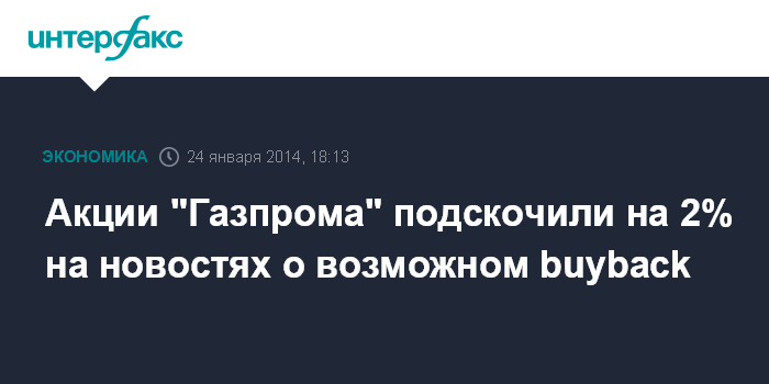 Москва. 24 января. INTERFAX.RU - Акции "Газпрома" вечером в пятницу подскочили на 2% на новостях о том, что концерн думает о выкупе собственных акций с рынка и изучает опыт ExxonMobil, о чем сообщил Агентству газовой информации (АГИ) источник в компании.