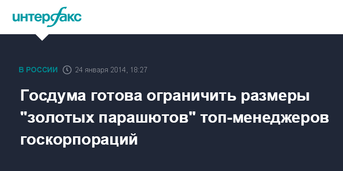 Москва. 24 января. INTERFAX.RU - Госдума в пятницу одобрила в первом чтении законопроект, ограничивающий "золотые парашюты" для руководителей госкорпораций шестикратным средним месячным заработком.
