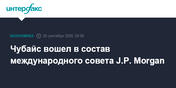 Москва. 26 сентября. INTERFAX.RU - Анатолий Чубайс вошел в состав международного совета банка J.P. Morgan - одного из старейших и крупнейших банков США.