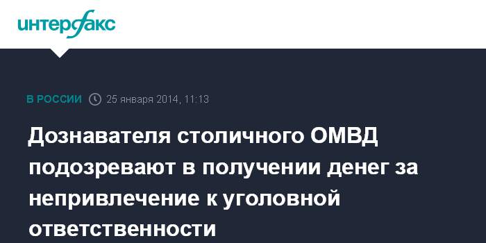 Москва. 25 января. INTERFAX.RU - Дознаватель ОМВД по району Митино задержана по подозрению в получении 100 тыс. рублей за непривлечение гражданина к уголовной ответственности, сообщили в пресс-службе ГУ МВД РФ по Москве "Интерфаксу" в субботу.