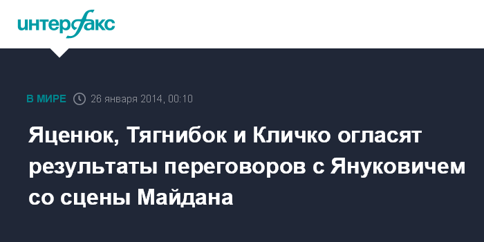 Москва. 26 января. INTERFAX.RU - Лидеры оппозиции Арсений Яценюк, Олег Тягнибок и Виталий Кличко, огласят результаты переговоров с президентом Украины Виктором Януковичем, со сцены Майдана, сообщает пресс-служба "Батькивщины".