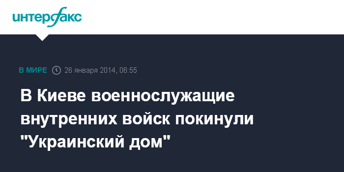 Москва. 26 января. INTERFAX.RU - В Киеве около 200 военнослужащих Внутренних войск МВД покинули здание "Украинского дома" со щитами и в шлемах, передает корреспондент агентства "Интерфакс-Украина" в воскресенье.