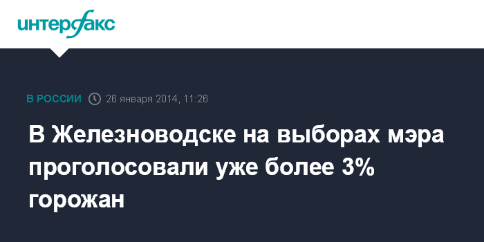 Москва. 26 января. INTERFAX.RU - Досрочные выборы главы города-курорта Железноводска проходят в Ставропольском крае. "Выборы в Железноводске начались организованно в 8:00 на всех 26 избирательных участках. Всего избирателей - 37 тыс. 861 , которые внесены в список. По состоянию на 10:10 проголосовало 1 тыс. 138 человек, это чуть более 3% избирателей", - сообщил журналистам председатель территориальной избирательной комиссии Железноводска Владимир Казахян.
