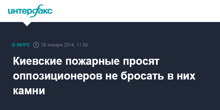 Москва. 26 января. INTERFAX.RU - Украинские пожарные призывают участников массовых акций не препятствовать выполнению ими профессиональных обязанностей - спасению людей, проезда к месту чрезвычайного события, гашению пожаров.
