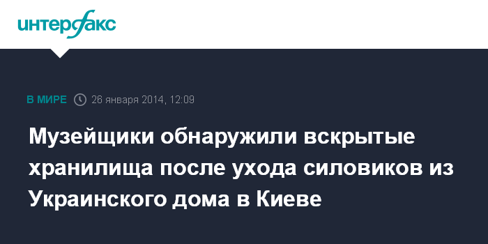 Москва. 26 января. INTERFAX.RU - В Киеве после оставления сотрудниками правоохранительных органов "Украинского дома" музейщики обнаружили, что музейные хранилища были вскрыты.