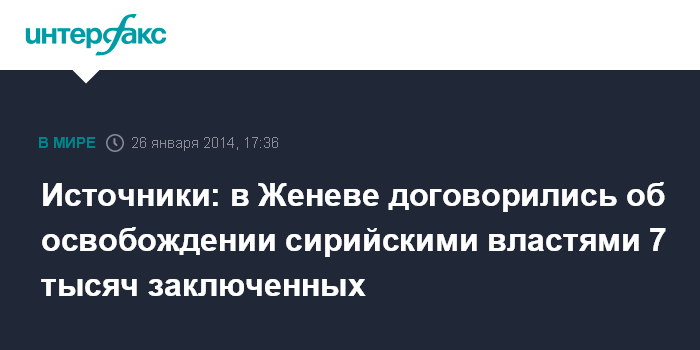 Москва. 26 января. INTERFAX.RU - Между правительственной и оппозиционной делегациями на межсирийских переговорах в Женеве была достигнута договоренность об освобождении властями около 7 тыс. заключенных, в том числе 2 тыс. подростков, сообщают близкие к переговорам источники. Вместе с тем, "Интерфакс" пока не располагает подтверждением данной информации из официальных источников.