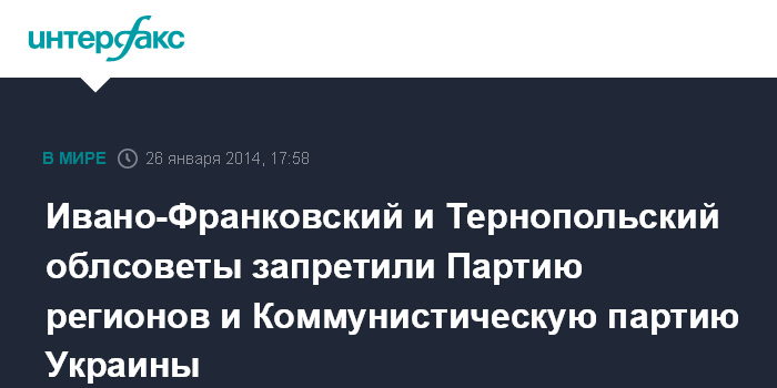 Москва. 26 января. INTERFAX.RU - Тернопольский и Ивано-Франковский областные советы приняли решение о запрете деятельности и символики Коммунистической партии Украины и Партии регионов на территории своих областей. Как сообщается на сайте Ивано-Франковского облсовета, соответствующее решение, принятое на внеочередной сессии, подписал накануне его председатель Василий Скрипничук.