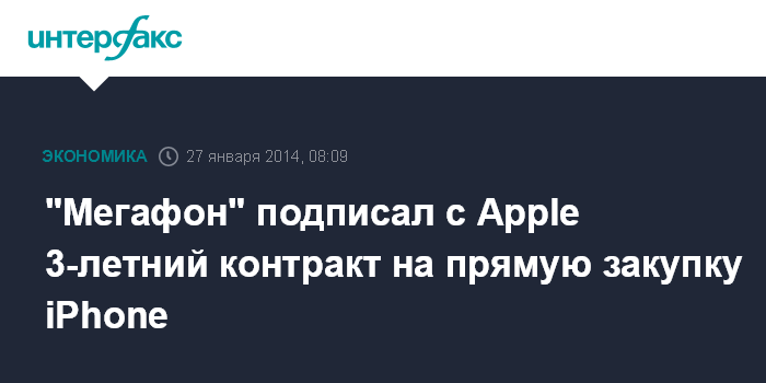Москва. 27 января. INTERFAX.RU - ОАО "Мегафон" подписало контракт с американской компанией Apple о прямой закупке смартфонов iPhone для последующей продажи в своей розничной сети.