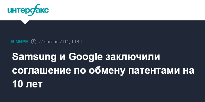 Сеул/Маунтин-Вью. 27 января. INTERFAX.RU - Samsung Electronics Co. и Google Inc. подписали долгосрочное соглашение о сотрудничестве в сфере международных патентов, говорится в обнародованном в понедельник пресс-релизе Samsung.