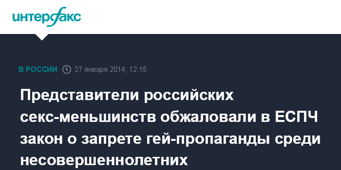 Москва. 27 января. INTERFAX.RU - ЛГБТ-активисты обжаловали российский закон о запрете пропаганды гомосексуальных отношений среди несовершеннолетних в Европейском суде по правам человека (ЕСПЧ) после того, как суд привлек двух активистов к ответственности за пикеты возле детской библиотеки в Архангельске.