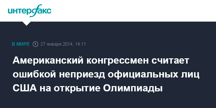 Москва. 27 января. INTERFAX.RU - Отсутствие на открытии зимних Олимпийских игр в Сочи представителей руководства США является ошибкой, считает председатель подкомитета по Европе и Евразии Палаты представителей Конгресса США республиканец Дана Рорабакер.