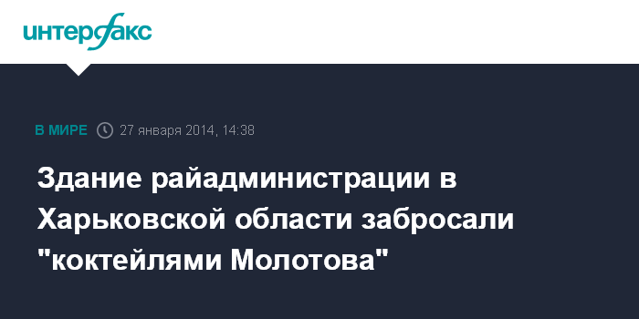 Харьков. 27 января. INTERFAX.RU - Неизвестные разбили окно на первом этаже в здании Валковской районной госадминистрации (Харьковская область) и бросили в него бутылки с зажигательной смесью.