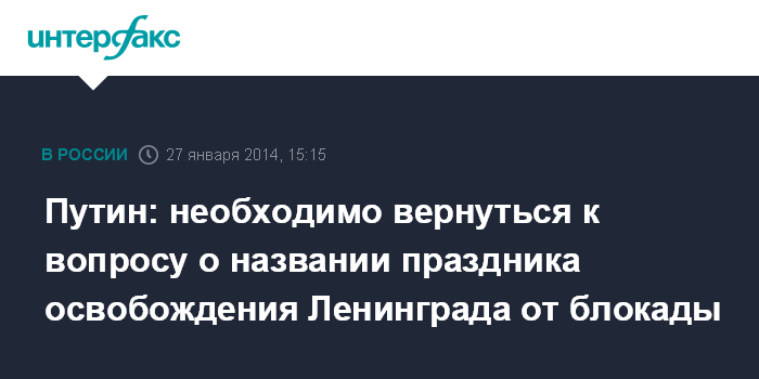 Разговор о возвращении названия зашел в ходе встречи Путина с ветеранами Великой Отечественной войны и жителями блокадного Ленинграда. Участники встречи посетовали на то, что сейчас название праздника формулируется как "Полное освобождение советскими войсками Ленинграда от фашистской блокады", что не отражает роль гражданского населения.