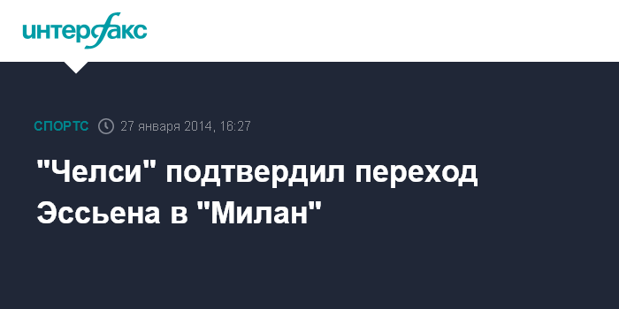 Москва. 27 января. INTERFAX.RU - Полузащитник "Челси" Майкл Эссьен стал игроком "Милана" на правах свободного агента, сообщает официальный сайт лондонского футбольного клуба.