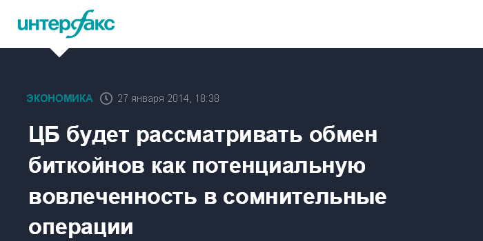 Москва. 27 января. INTERFAX.RU - Банк России предупреждает, что предоставление российскими юридическими лицами услуг по обмену "виртуальных валют" (в частности, биткойн) на рубли и иностранную валюту, а также на товары (работы, услуги), будет рассматриваться как потенциальная вовлеченность в осуществление сомнительных операций в соответствии с законодательством о противодействии легализации (отмыванию) доходов, полученных преступным путем, и финансированию терроризма, говорится в сообщении пресс-службы ЦБ РФ.