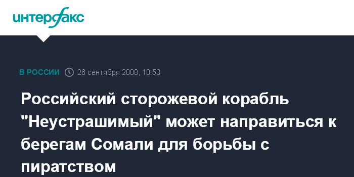Москва. 26 сентября. INTERFAX.RU – Сторожевой корабль "Неустрашимый" Балтийского флота, возможно, примет участие в борьбе с пиратством у берегов Сомали, сообщил в пятницу "Интерфаксу-АВН" источник в штабе Балтфолта.