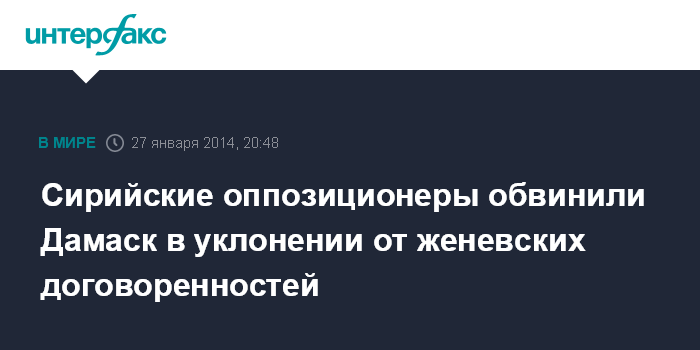 Дубай. 27 января. INTERFAX.RU - Представленный делегацией сирийского правительства документ об основных принципах урегулирования конфликта противоречит целям "Женевы-2", говорится в сообщении, опубликованном на странице Национальной коалиции сирийских революционных и оппозиционных сил (НКСРОС) в "Твиттере".