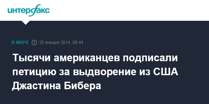 "Мы, граждане США, полагаем, что поп-культура искажает представление о нас. Мы хотели бы, чтобы опасный, деструктивный, безответственный любитель наркотиков Джастин Бибер был депортирован и лишен вида на жительство. Он не только угрожает безопасности наших граждан, но и оказывает ужасающее влияние на молодежь", - сказано в петиции, размещенной на сайте Белого Дома.