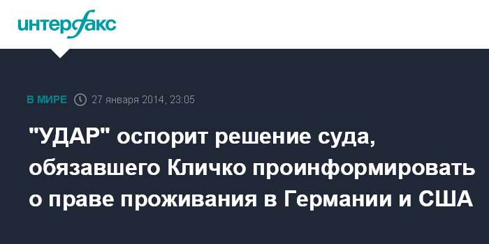 Киев. 27 января. INTERFAX.RU - "УДАР" готовит апелляцию на решение Окружного административного суда Киева, обязавшего лидера партии Виталия Кличко проинформировать о наличии права проживания в Германии и США.