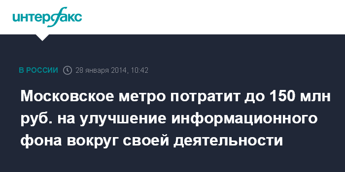 Москва. 28 января. INTERFAX.RU - ГУП "Московский метрополитен" объявил конкурс на создание системы информационного реагирования и реализации комплексной программы мер по улучшению информационного фона вокруг деятельности московского метро.