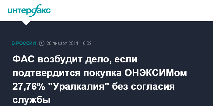 Москва. 28 января. INTERFAX.RU - Федеральная антимонопольная служба (ФАС) возбудит административное дело, если подтвердится информация о покупке компаниями, входящими в группу ОНЭКСИМ, 27,76% голосующих акций ОАО "Уралкалий" без предварительного согласия ФАС.