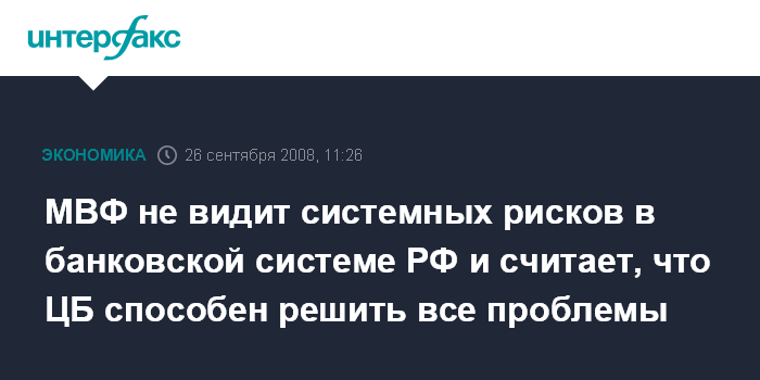 Москва. 26 сентября. INTERFAX.RU – Международный валютный фонд (МВФ) не видит системных рисков в российской банковской системе.