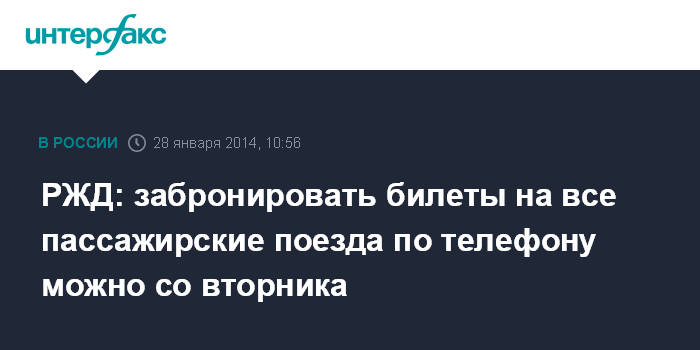 Москва. 28 января. INTERFAX.RU - Забронировать по телефону билеты на все поезда "дочки" ОАО "Российские железные дороги" (РЖД) - ОАО "Федеральная пассажирская компания" (ФПК) - можно со вторника.
