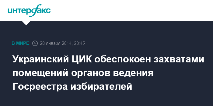Киев. 28 января. INTERFAX.RU - В Центральной избирательной комиссии обеспокоены многочисленными случаями захватов помещений органов ведения Госреестра избирателей и уничтожения их оборудования в различных регионах.