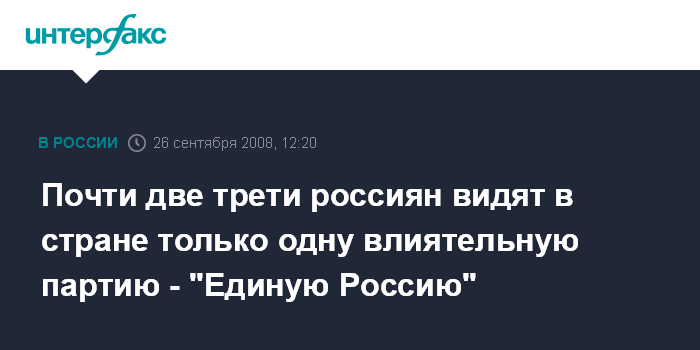 Москва. 26 сентября. INTERFAX.RU – Более половины россиян считает, что в России есть только одна сильная партия - "Единая Россия", остальные же политические партии не играют заметной роли в жизни страны, отмечают социологи.